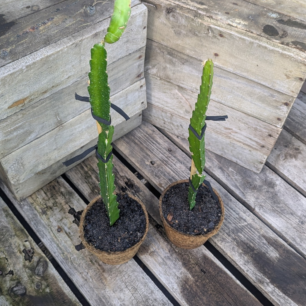 They are a climbing cactus so it’s best to grow them on a trellis or frame.
